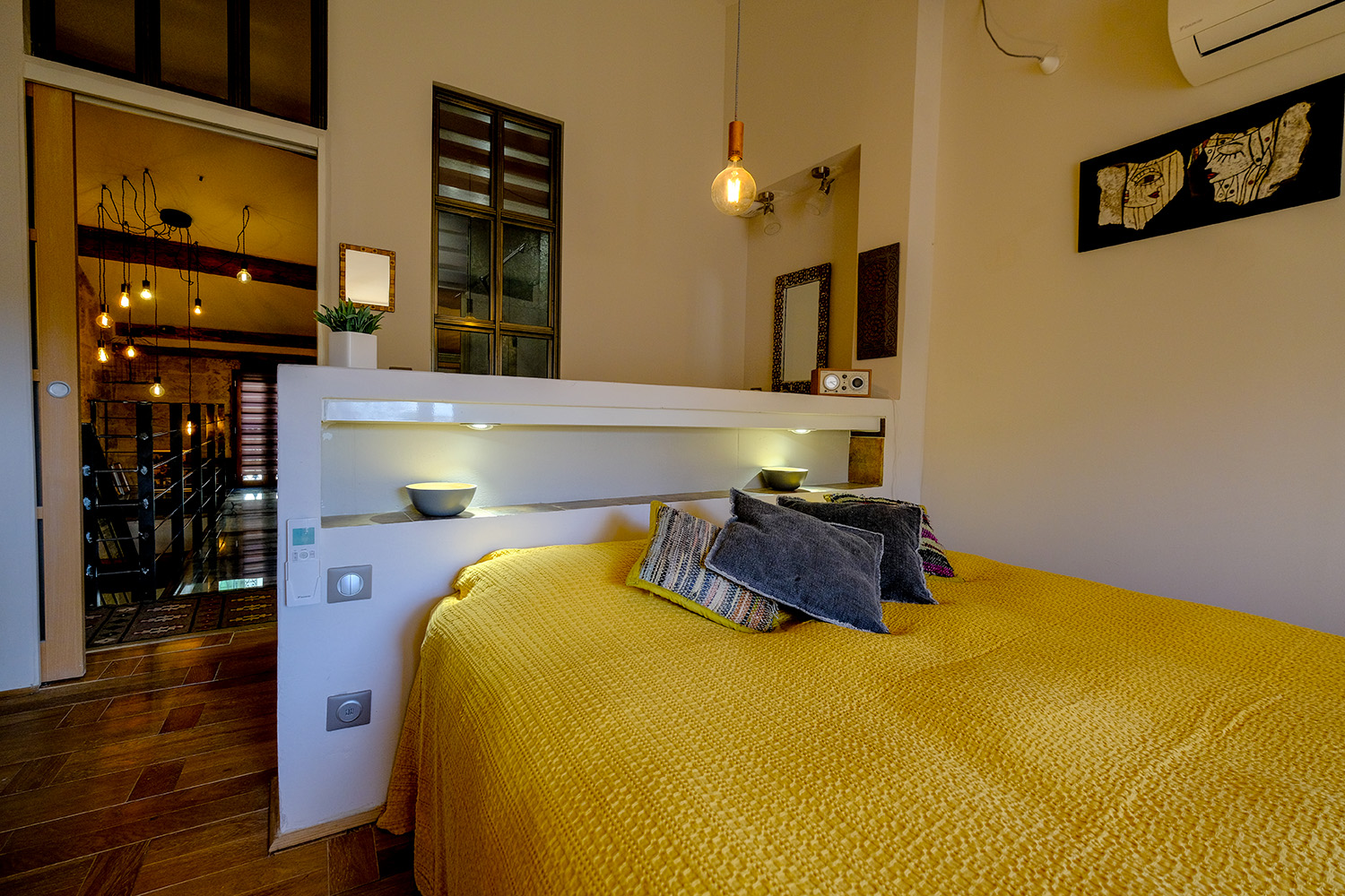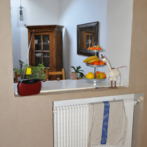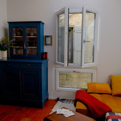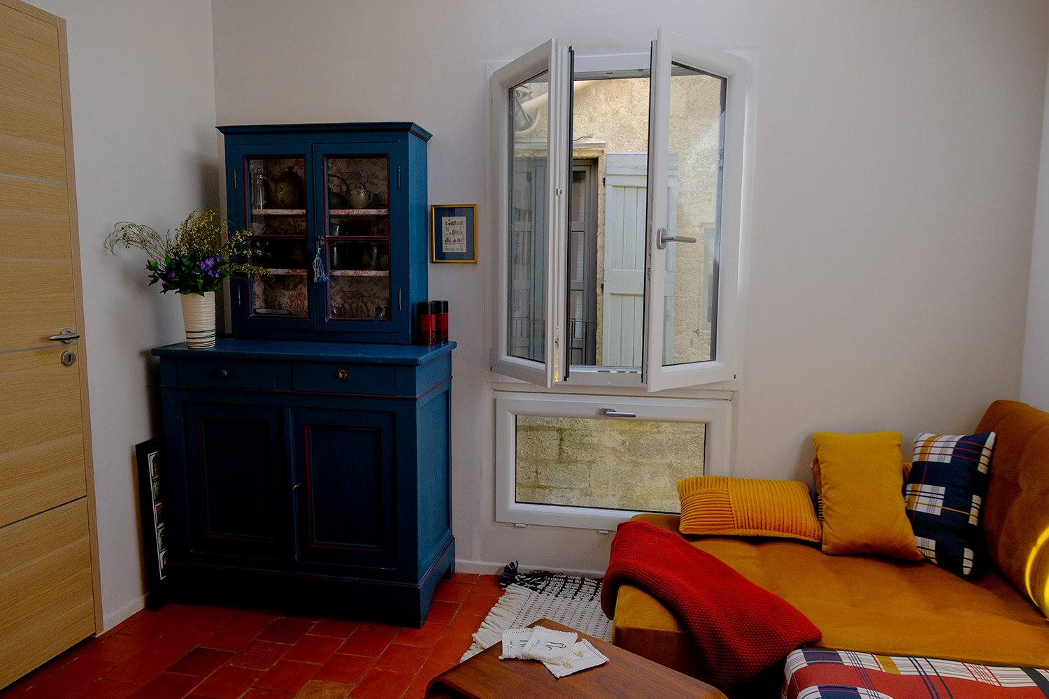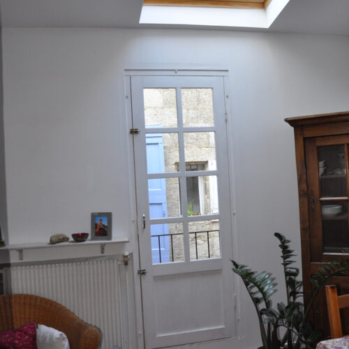 Above the living room, adjacent to the glass “passerelle” is now a cosy and comfortable teleworking space. With a computer monitor to the right and Ian’s expertly hung tv screen to the left. So when the laptop closes in the day, the screen is the modest movie interface by night! I love tele-working in this airy space, with Mum’s stone wall to the right and the passerelle in between.
