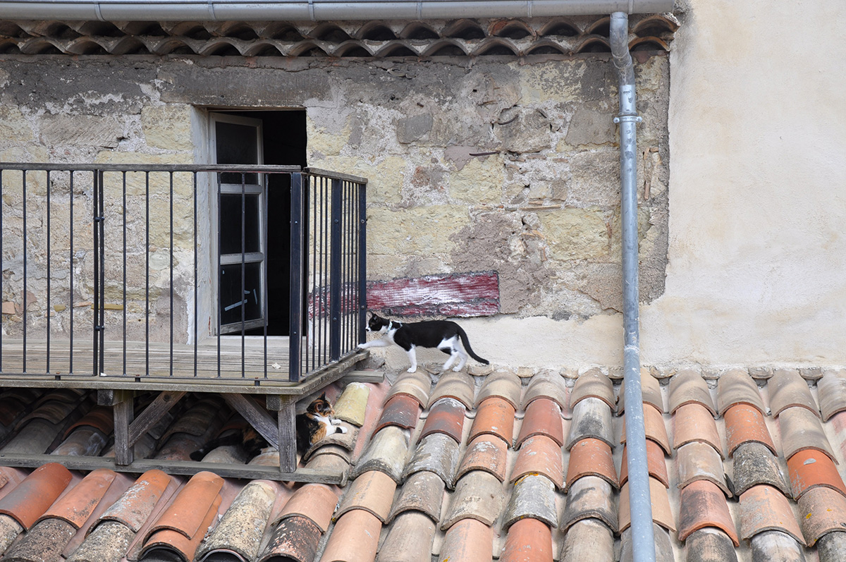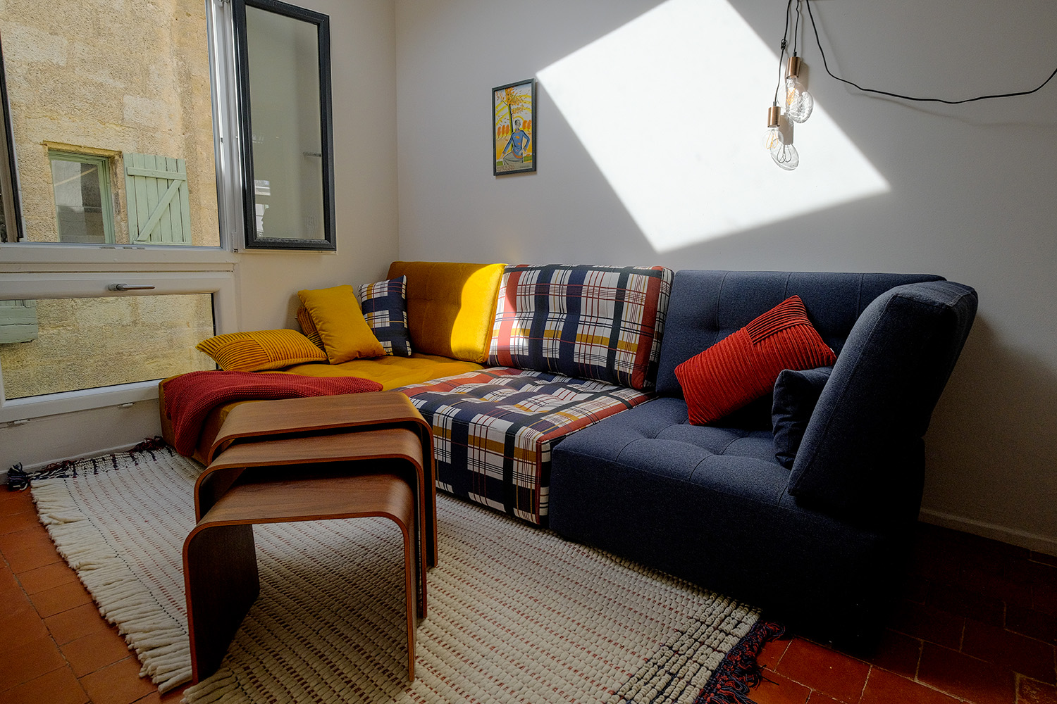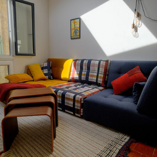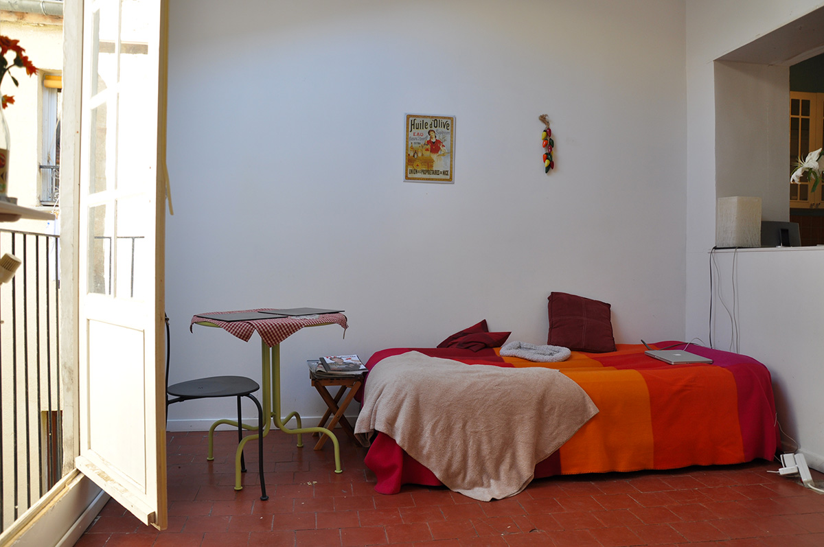 Above the living room, adjacent to the glass “passerelle” is now a cosy and comfortable teleworking space. With a computer monitor to the right and Ian’s expertly hung tv screen to the left. So when the laptop closes in the day, the screen is the modest movie interface by night! I love tele-working in this airy space, with Mum’s stone wall to the right and the passerelle in between.