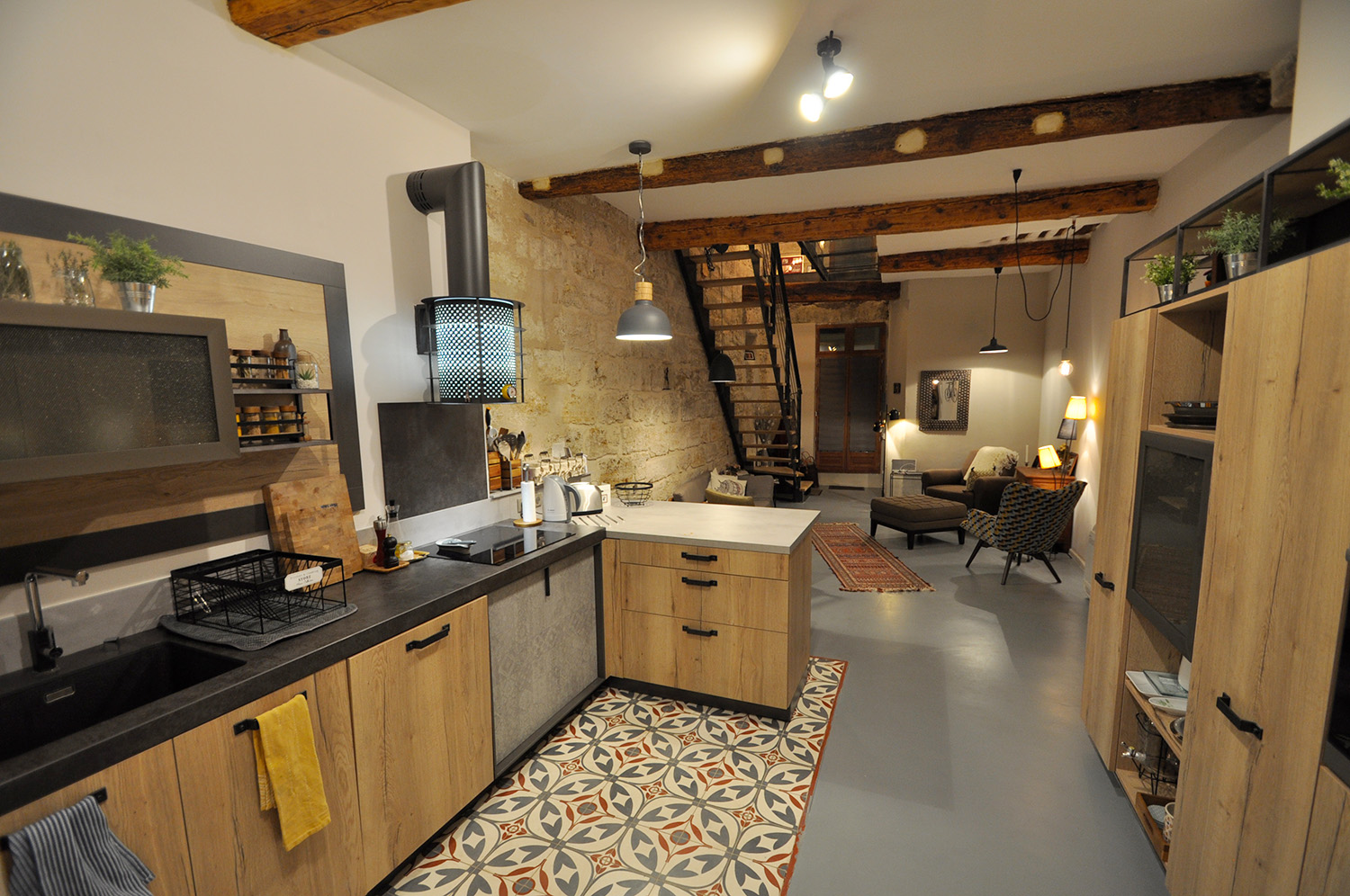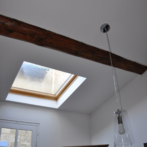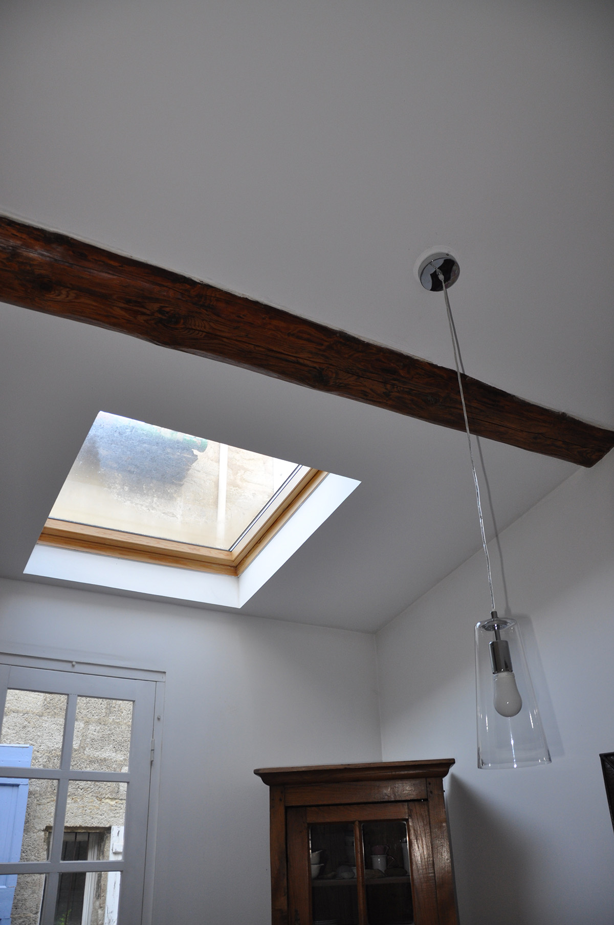 Next we took out the old wall separating the living from the kitchen and replaced the former kitchen with a custom made “Loft Kitchen” design from Eric Hanriot’s kitchen design studio in town. Ian painstakingly revealed the former wooden beamed “French ceiling” in one corner. The mind’s eye can imagine the rest of it in the same form. The new industrial floor is a dream to wheel a suitcase over. Laurent a local tiling expert turned wood and steel connoisseur single handedly constructed Anne’s concept stairs and a glass floor “passerelle” that I had first seen in a French home déco magazine. Laurent also built the wood and iron “air dressing” on the 3rd floor.