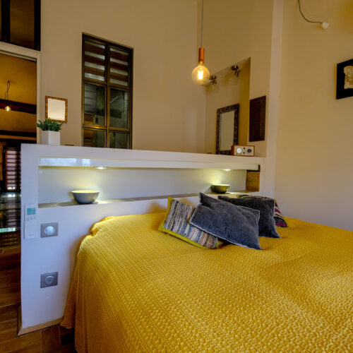 With an element of style inspired by a holiday to Madagascar, Ian constructed a wall to separate the bed from the sink basin table. On the bed side, a niche carved into the separation wall serves as a bookcase and odds ‘n ends shelf which I love.