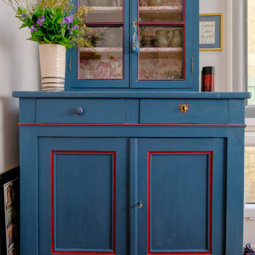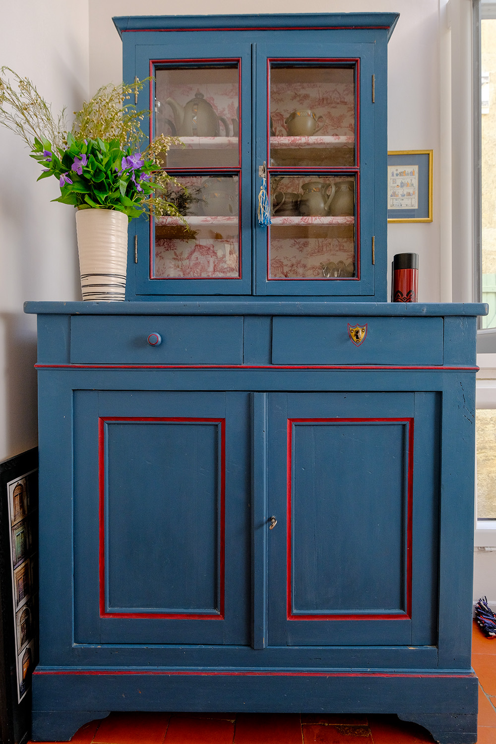 Formerly the previous owners’ dining room, this space always felt like the future heart of the floor with its (formally unauthorisd) velux window. We turned the opening previously between the kitchen and dining room into a full door; and sealed the previous doorway into a nest of wooden shelves. Result: a reading / writing / tea and breakfast room, filled with natural light and inspiring déco.